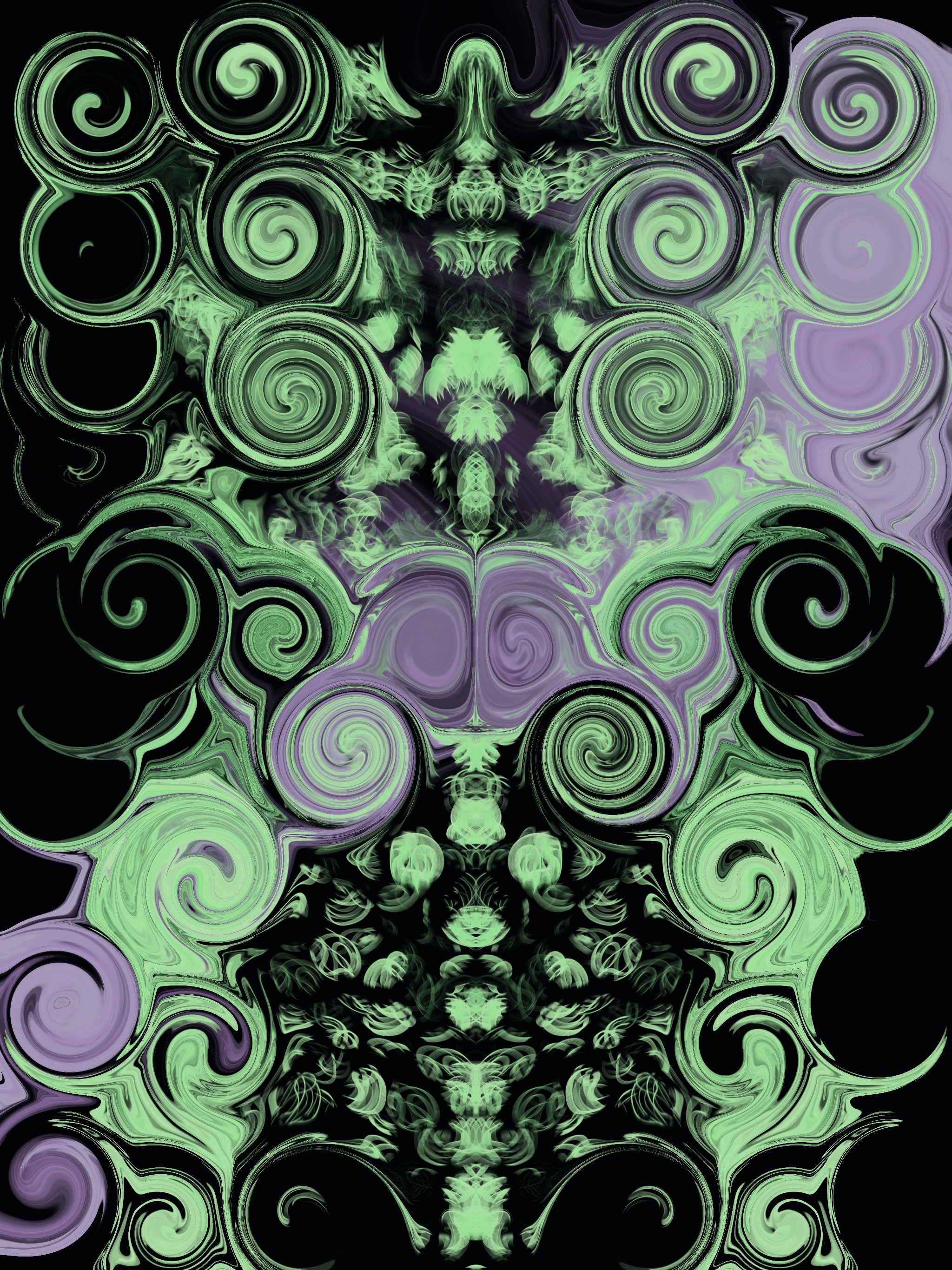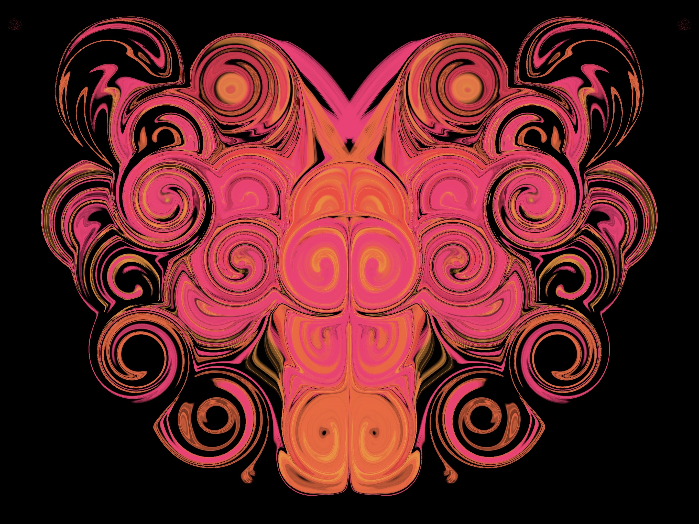 Spirit of the Swirls is a symmetrical vision woven from spirals, resembling a mystical, floating entity. The vivid hues of pink, orange, and black evoke both playfulness and power, while the composition suggests an energetic being inviting viewers into a dialogue with their imagination. This piece emerges from the deeper layers of the mind, where order and chaos are forever entwined in motion.