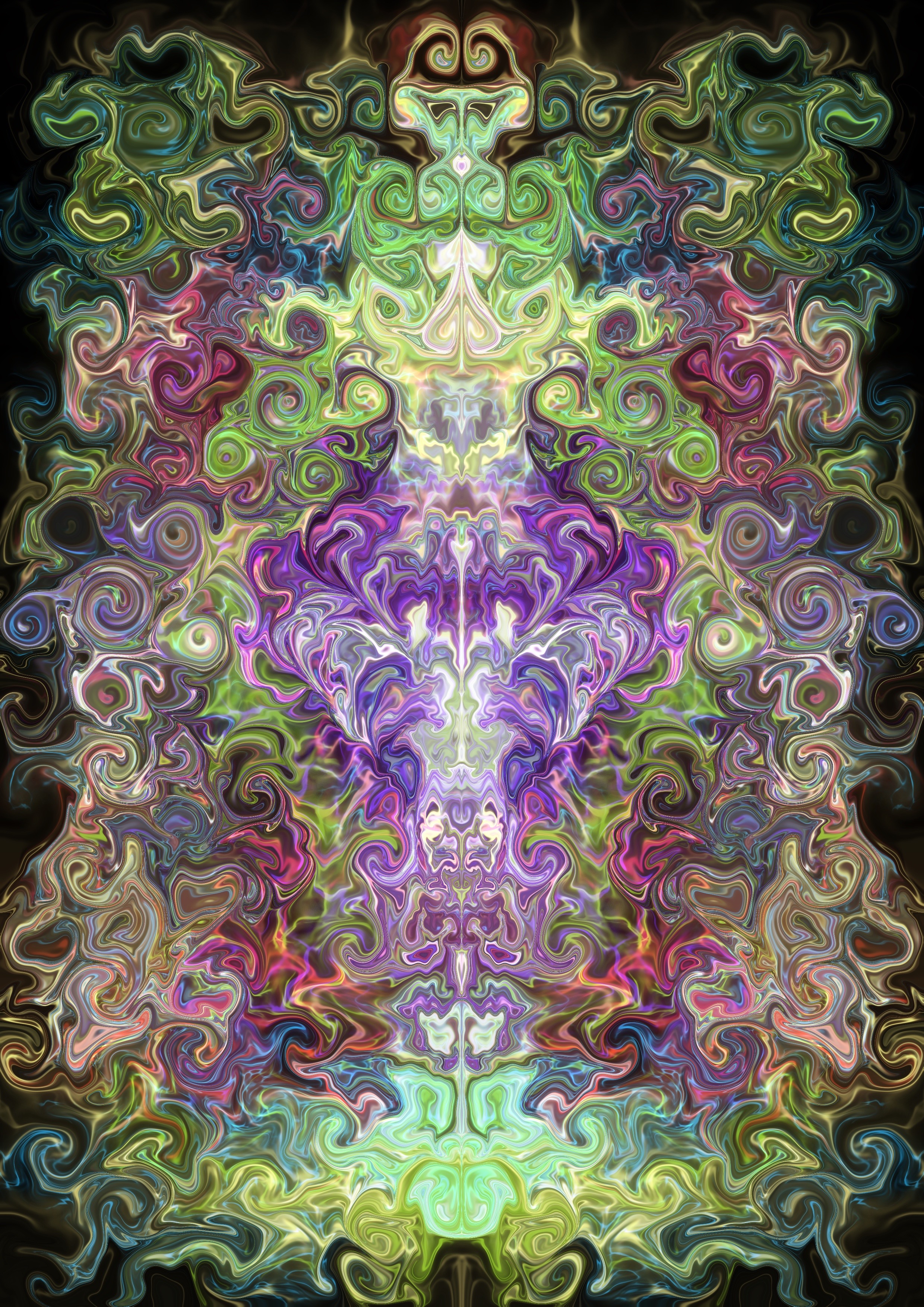 A psychedelic, symmetrical composition evoking an otherworldly being made of fractal currents and vibrant, swirling energies a visual manifestation of chaos, order, and transformation intertwined.